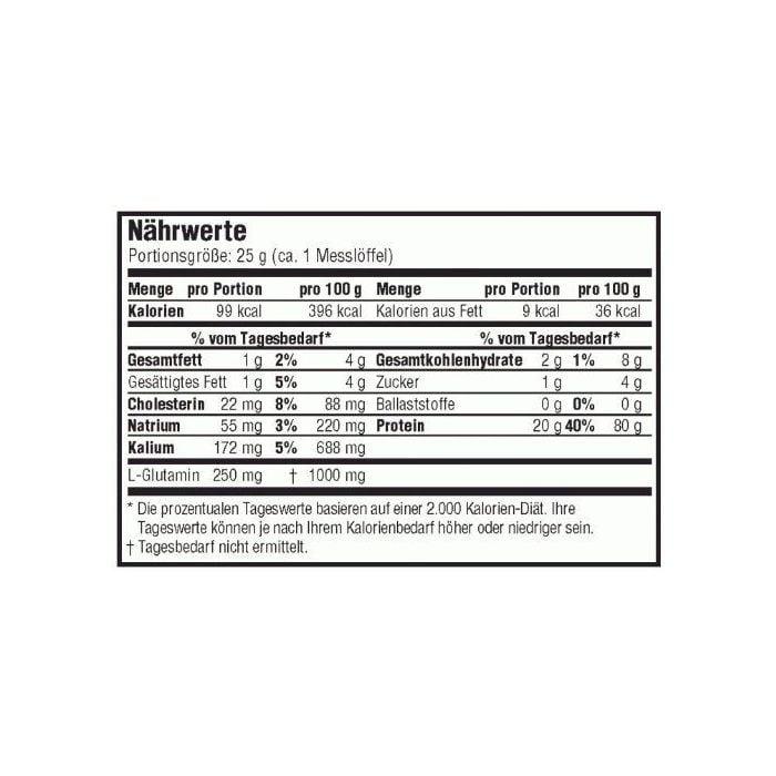Příchuť čokoláda: Cross-flow mikrofiltrovaný a ultrafiltrovaný syrovátkový proteinový izolát (obsahující beta laktoglobulin, alfa laktalbumin, hovězí sérový albumin, imunoglobulin G, laktoferin, glykomakropeptidy proteinové microfrackce), L-glutamin, zahušťovadlo (Xanthan), umělá sladidla (acesulfam K, sukralóza ), kakaový prášek (10-12%), čokoládová příchuť.