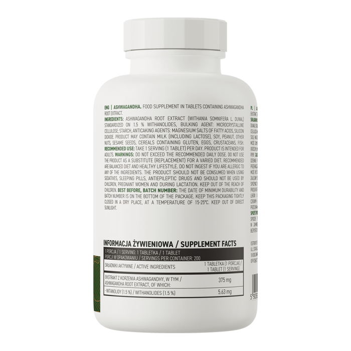 Extrakt z kořene Ashwagandhy (Withania somnifera L. Dunal) standardizovaný na 1,5 % withanolidů, objemové činidlo: mikrokrystalická celulóza, škrob, protihrudkující látky: hořečnaté soli mastných kyselin, oxid křemičitý.