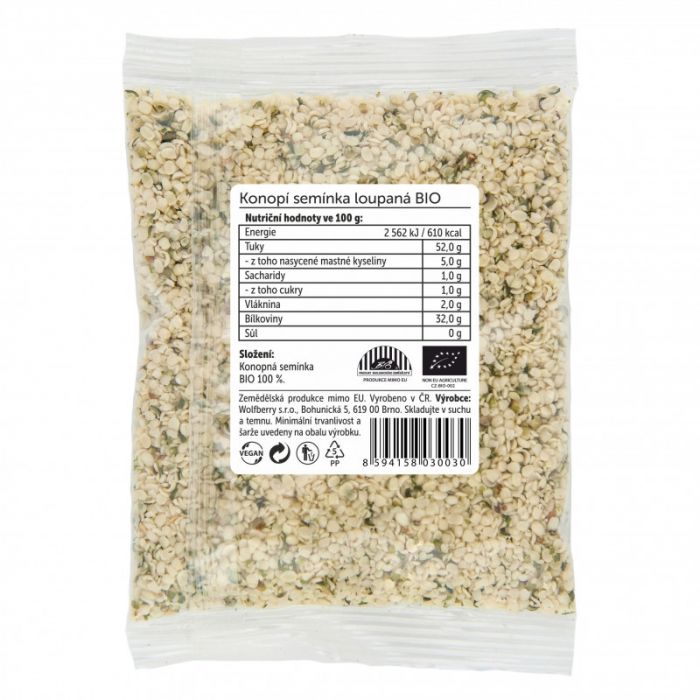 Konopná semínka neobsahují žádné stopy psychotropní látky THC, která se nachází pouze v listech a květech rostliny konopí. Běžně se produkují konopná semena s vyšším obsahem nečistot, a to kolem 0,5%, ale Wolfberry konopná semínka obsahují pouze 0,1% těchto nečistot. Navíc po vyloupání zůstává běžně v podobném produktu obsah 2 až 7% tvrdých slupek, ale Wolfberry garantuje maximálně 0,2% slupek v tomto produktu. Semínka v té nejvyšší biologické kvalitě jsou vhodná i pro vegany, a jsou skvělou alternativou i pro lidi, kteří trpí alergiemi na ořechy. Výborně se hodí k přípravě másla, sýra, mléka, pomazánek, pesta, nápojů, nebo jako součást mnoha receptů.