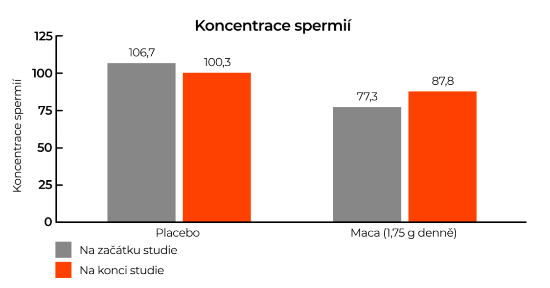 Skupina vědců sledovala ve studii vliv užívání macy na kvalitu spermií u osmnácti zdravých mužů. Jedenáct z nich užívalo během dvanácti týdnů 1,75 g macy, zatímco zbylých sedm dostalo placebo. Cílem bylo zjistit, zda má maca vliv na kvalitu a počet spermií. Ukázalo se, že užíváním macy se zvýšila koncentrace spermií či například počet pohyblivých spermií průměrně o 14 %. [9]