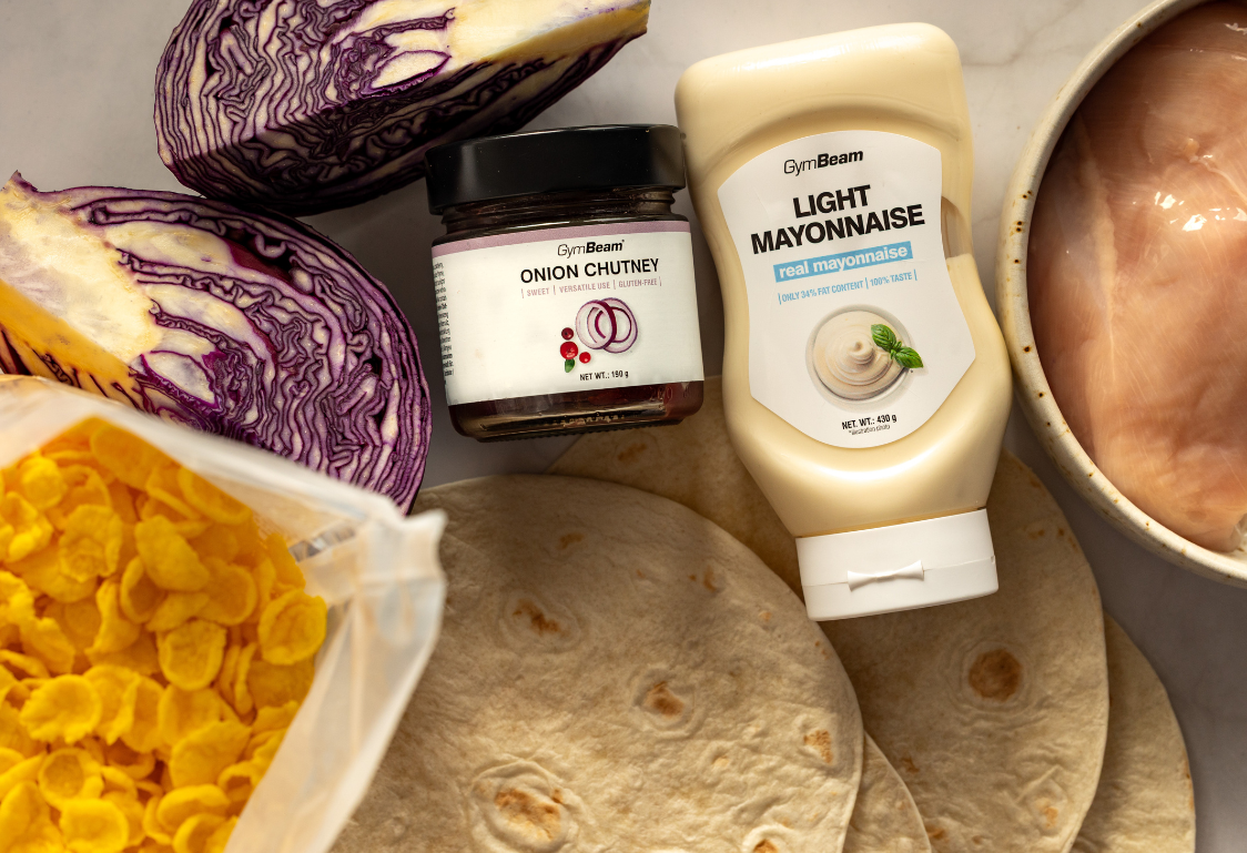 Na závěr si vezmeme tortillu a pomažeme ji majonézou i cibulovým chutney. Na to bohatě navrstvíme náš zelný salát a naskládáme hotové kuřecí stripsy. Tortillu už jen pevně zabalíme a z obou stran ji ještě krátce opečeme na suché pánvi. Krásně se tím propojí chutě a můžeme rovnou podávat.