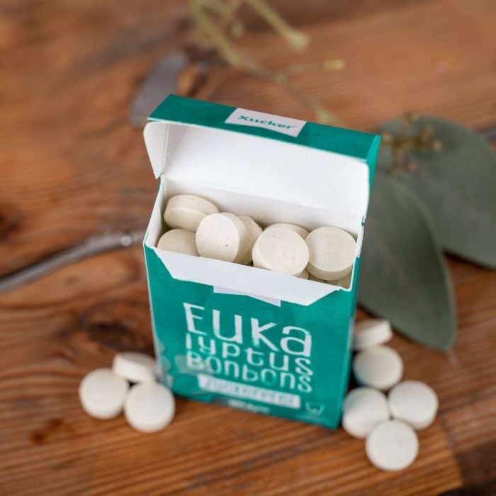 Příchuť eukalyptus: Sladidlo Xylitol (93 %), mastné kyseliny a hořečnaté soli mastných kyselin, prášek z eukalyptových listů (0,5 %), mentolový prášek (0,4 %), eukalyptová aroma, přírodní aroma, koriander (0,2 %), kardamon (0,2 %), šalvěj (0,1 %).