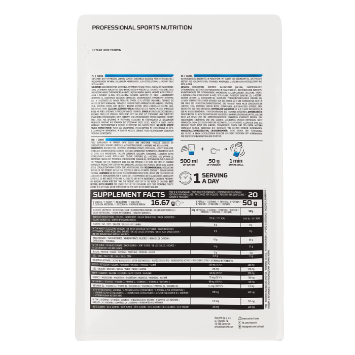 Carbo je praktická směs sacharidů, kterou využijí sportovci a všichni aktivní lidé. Je navíc obohacena o aminokyseliny beta-alanin, l-karnitin a vybrané vitamíny i minerální látky, z nichž každá plní zodpovědně svou funkci. Obsažený hořčík přispívá k normálnímu energetickému metabolismu, rovnováze elektrolytů, správné činnosti svalů a nervové soustavy. Společně s vitamínem B6 pomáhá snížit únavu i vyčerpání. Svou roli má ovšem i vitamín C, který pomáhá s udržením normální funkce imunity. Navíc přispívá k normální tvorbě kolagenu pro optimální funkci kostí a chrupavek, které jsou nedílnou součástí pohybového aparátu. Pozadu ovšem nezaostává ani vápník, který přispívá k normální srážlivosti krve, optimálnímu energetickému metabolismu, normální činnosti svalů a nervových přenosů.
