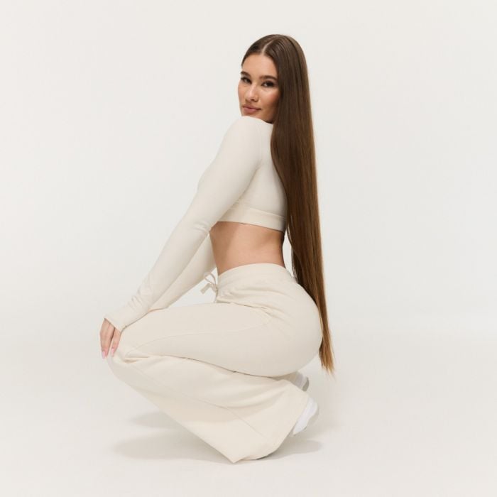 Tento model okamžitě upoutá pozornost svým moderním zvonovým střihem ve stylu „flare“, který se od kolen směrem dolů jemně rozšiřuje. Díky tomu lichotí postavě a působí velmi žensky. Protože nemají kapsy, působí velmi elegantním a čistým dojmem. Navíc, tyto tepláky se středně vysokým pasem jsou vybaveny praktickou elastickou gumou a stahovací šňůrkou, díky čemuž si je můžete přizpůsobit svým potřebám.