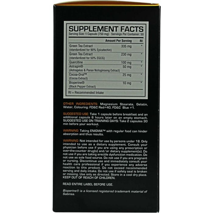 Enigma je unikátní doplněk, který vám pomůže prolomit všechny překážky! Jedinečné složení ingrediencí je nejlepším řešením pro všechny fyzicky aktivní lidi. Je vynikající pro posílení těla a postará se i o výbornou přípravu na každé následující cvičení. Posiluje syntézu svalové hmoty, brání katabolismu, zvyšuje rozvoj síly a vytrvalosti. Umožní vám dosáhnout ještě lepších výsledků! Extrakt ze zeleného čaje zajistí účinnější redukci tuků a lepší antioxidační ochranu, a další sloučeniny přispívají k efektivnímu vstřebávání živin, zlepšené regeneraci a výrazně nižšímu pocitu únavy.