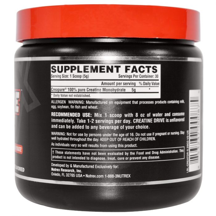Creatine Drive Black je kreatin monohydrát vyroben patentovaným výrobním procesem, který zaručuje nejbezpečnější, nejčistší a nejkoncentrovanější množství kreatin monohydrátu. Podle výsledků výzkumů, malé koncentrované dávky vykazují lepší nasycení v krevní plazmě, a tento produkt byl vytvořen na základě studií, proto nevyžaduje vysoké dávkování a nasycovací fáze.