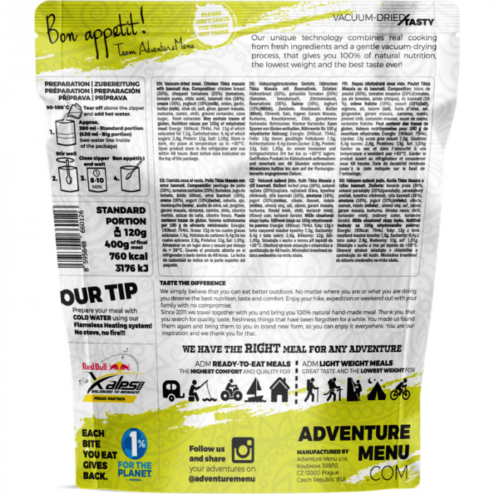 Kuře Tikka Masala s rýží basmati je oblíbená indická pochoutka vhodná na cesty. Celý pokrm se nejprve připravuje tradičním způsobem s využitím kvalitních ingrediencí. Poté přichází na řadu unikátní technologie sušení Vaccum-Dried Tasty®. Díky té si pokrm zachovává skvělou chuť a nutriční hodnoty. Zároveň při ní dochází k úspoře hmotnosti až o 80 %. Výsledný produkt se balí do praktických vakuových sáčků, díky kterým s sebou nenesete žádný vzduch navíc. Výsledkem je ultralehký pokrm, který využijete hlavně na cestách. Oceníte ho zejména v případech, kdy si s sebou chcete vzít výživné jídlo, ale zároveň šetříte prostor a každý gram, který ponesete na zádech. Skvěle se hodí na horskou turistiku, kempování nebo cyklistické výlety. Můžete si jej ovšem vychutnat i doma, když nemáte čas na vaření.