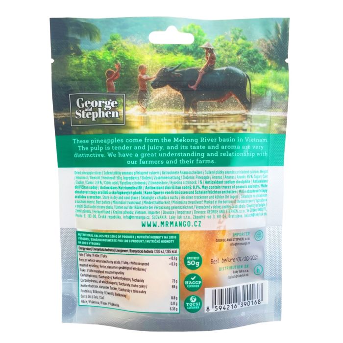 Mr. Pineapple je vietnamský ananas z povodí řeky Mekong v sušené formě. Jedná se o velmi známé a oblíbené tropické ovoce. Má křehkou šťavnatou dužinu, výraznou sladkou chuť a ananasové aroma. Skvěle poslouží jako rychlý snack, ale je vhodný i ke snídani, kde ho můžete kombinovat například s kaší nebo müsli. Díky čistě rostlinnému složení ho ocení i vegetariáni a vegani.