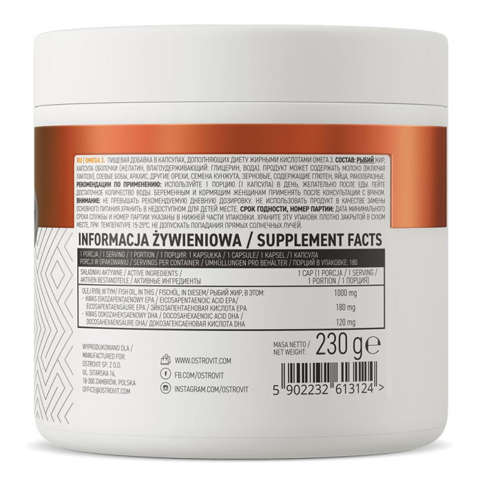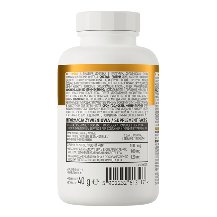 Omega 3 je doplněk stravy s obsahem omega 3 mastných kyselin z rybího oleje. Ten je zdrojem kyseliny eikosapentaenové (EPA) a dokosahexaenové (DHA), které si tělo nedokáže samo vytvořit. Tento doplněk má formu praktických kapslí a v jedné dávce najdete 180 mg EPA a 120 mg DHA. Ty jsou známé podporou správné činnosti srdce. Pro dosažení příznivého účinku je potřeba přijímat 250 mg EPA a DHA denně, což s tímto produktem snadno splníte.