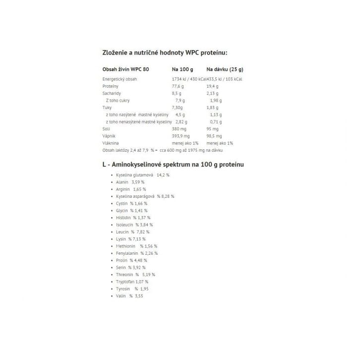 WPC 80 protein je kvalitní syrovátkový koncentrát základní úpravy, který se může pochlubit původem ze Slovenska a vysokým obsahem bílkovin (skoro až 80%). Je ideální pro užívání ráno před snídaní, kvůli rychlé vstřebatelnosti a nezatěžujícímu trávení.