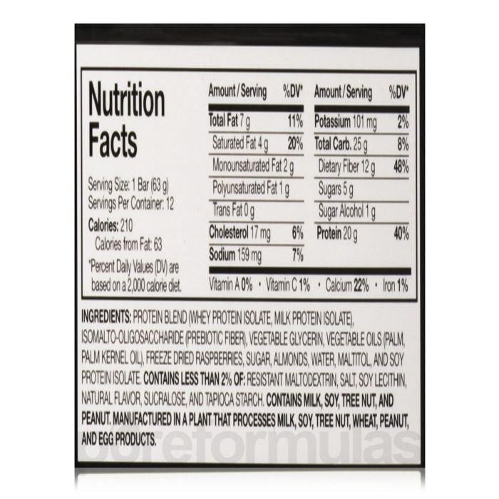 Příchuť čokoládové brownie: proteinová směs (syrovátkový proteinový izolát, mléčný proteinový izolát), isomalt-oligosacharidy (prebiotická vláknina), čokoládové kousky (čokoládový likér (zpracovaný metodou alkali), cukr, kakaové máslo, vanilka), glycerin, rostlinný olej (palmový, palmový kernel olej), cukr, mandle, voda, sojový proteinový izolát, maltitol, kakao (zpracované metodou alkali), méně než 2%: sůl, sójový lecitin, přírodní aroma, sukralóza, vanilka, tapiokový škrob.