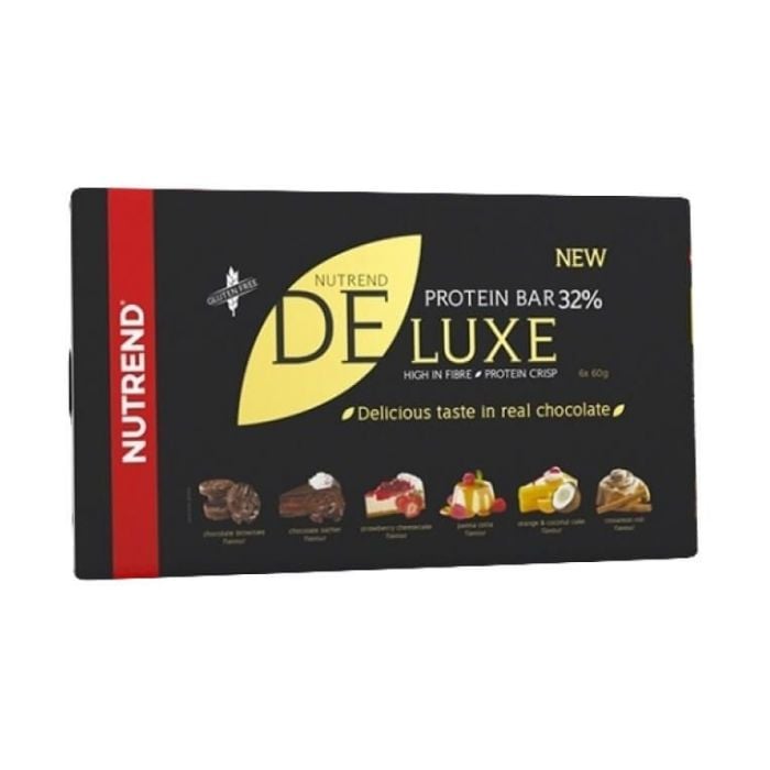 Proteinová tyčinka Deluxe je bezlepková proteinová tyčinka, která obsahuje až 32 % bílkovin. Má výbornou chuť a vysoký podíl vlákniny. Užijte si luxus, výkon a delikátní chuť v jednom! Je vhodná jako snack kdykoliv během dne pro doplnění bílkovin.
