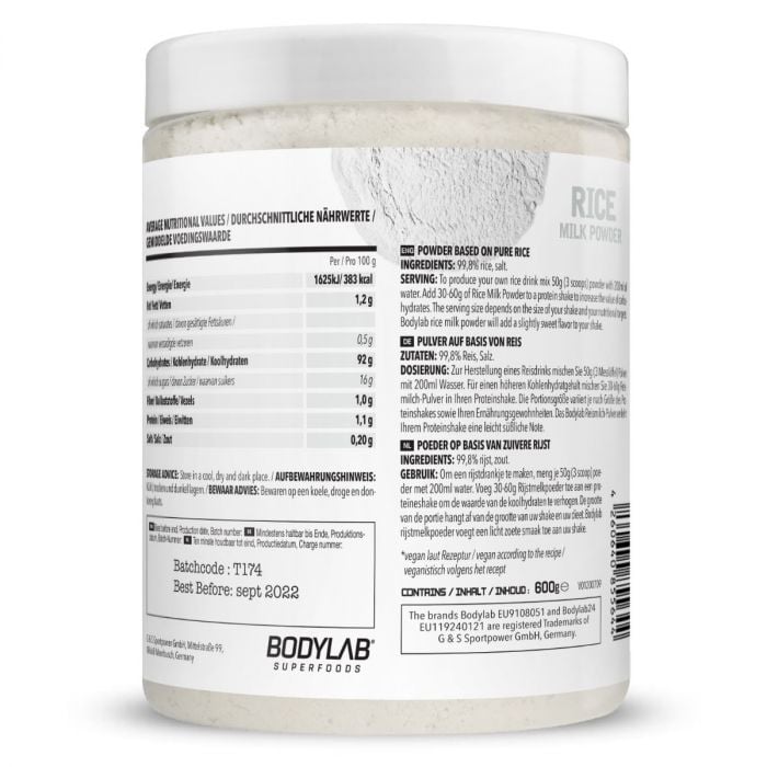 Rýžový nápoj v prášku je snadno rozpustný zdroj sacharidů, který se skvěle hodí k obohacení proteinového koktejlu nebo jako alternativa mléka. Obsahuje 99,8 % rýže, pouze 0,2 g soli a minimum tuku. Neobsahuje přidaný cukr, laktózu, umělé konzervanty, barviva, ani sladidla. Je vhodný i pro vegany.
