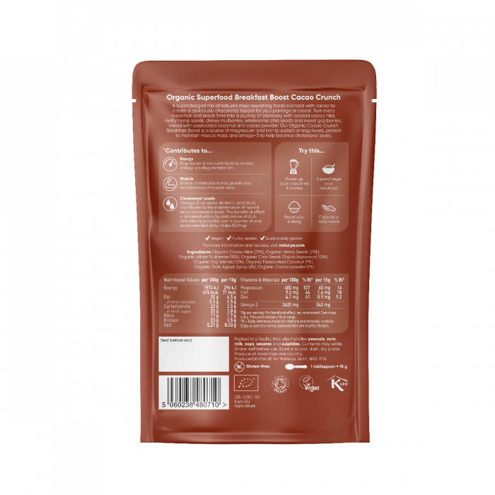 Snídaňová směs Superfood Breakfast Boost Cacao Crunch je výjimečným zdrojem bílkovin, vlákniny, omega-3 mastných kyselin a minerálů. Nacházejí se v ní výhradně bio složky, jako drcené kakao, goji, konopná a chia semínka či moruše bílá.