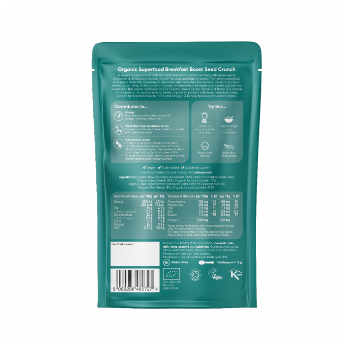 Snídaňová směs Superfood Breakfast Boost Seed Crunch je výjimečným zdrojem bílkovin, vlákniny, omega-3 mastných kyselin a minerálů. Nacházejí se v ní výhradně bio složky, jako drcené kakao, goji, konopná a chia semínka či moruše bílá.