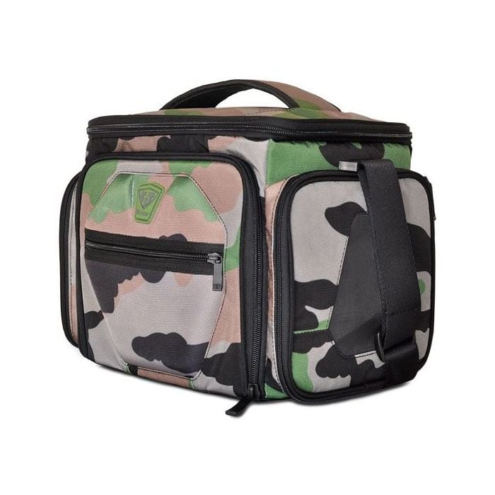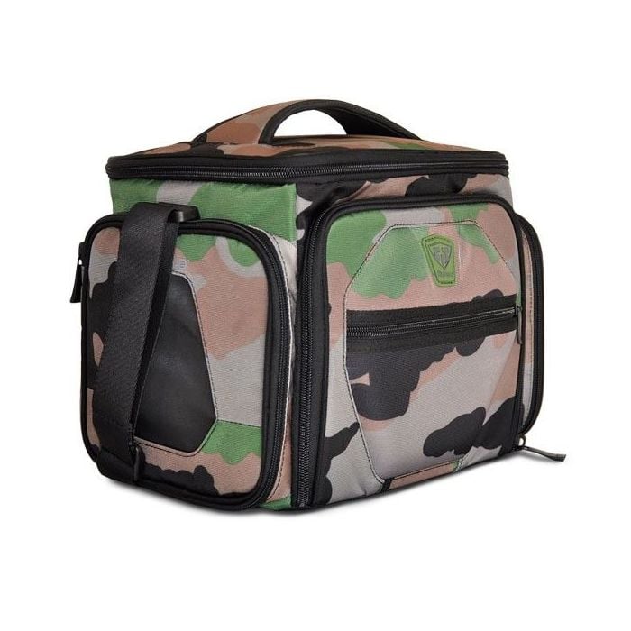 Sportovní taška na jídlo The Shield Camo s pěkným designem, inovativními funkcemi a materiálem nejvyšší kvality. Je lehká, přenosná, vyrobená z pevného polyesterového nylonu. Obsahuje 3 velké boxy na hlavní jídlo, 2 chladicí gely, dávkovač na vitamíny, suplementy a proteinové nápoje, 2 inteligentní kapsy na láhev, proteinové tyčinky a ovoce. Udrží vaše jídlo čerstvé až 8 hodin.