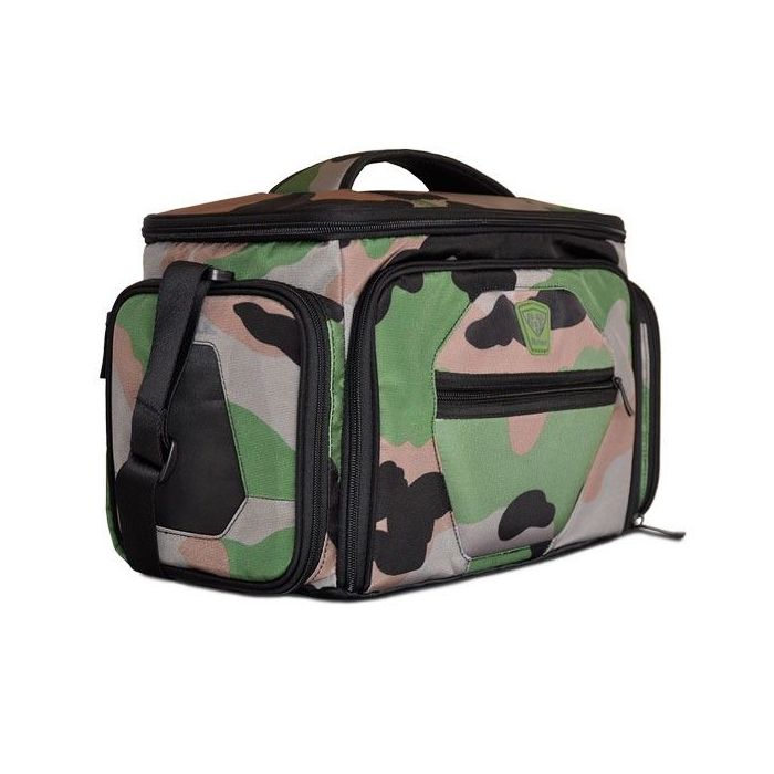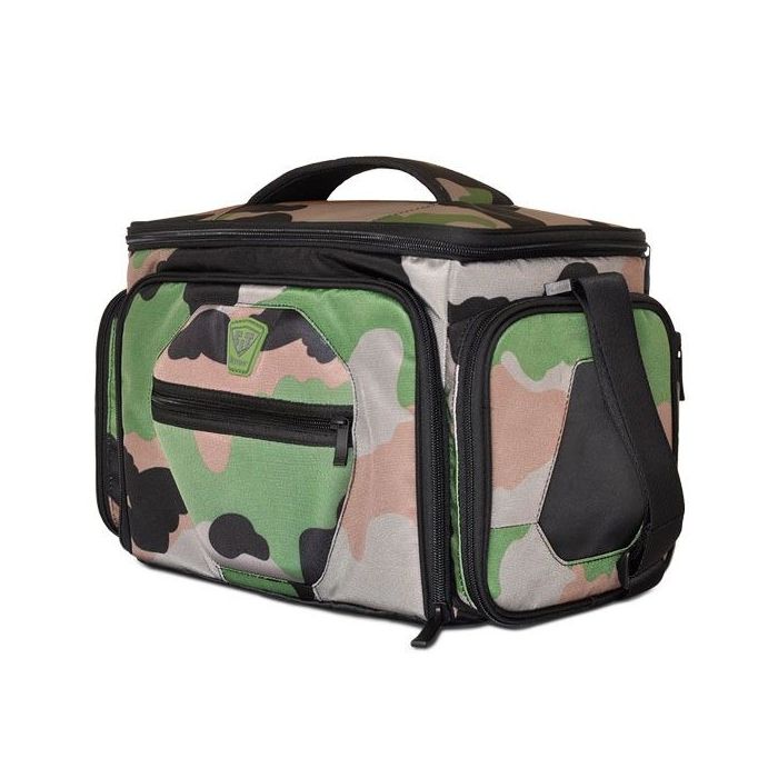 Sportovní taška na jídlo The Shield LG Camo s pěkným designem, inovativními funkcemi a materiálem nejvyšší kvality. Je lehká, přenosná, vyrobená z pevného polyesterového nylonu. Obsahuje 5 velké boxy na hlavní jídlo, 2 chladicí gely, dávkovač na vitamíny, suplementy a proteinové nápoje, 2 inteligentní kapsy na láhev, proteinové tyčinky a ovoce. Udrží vaše jídlo čerstvé až 8 hodin.