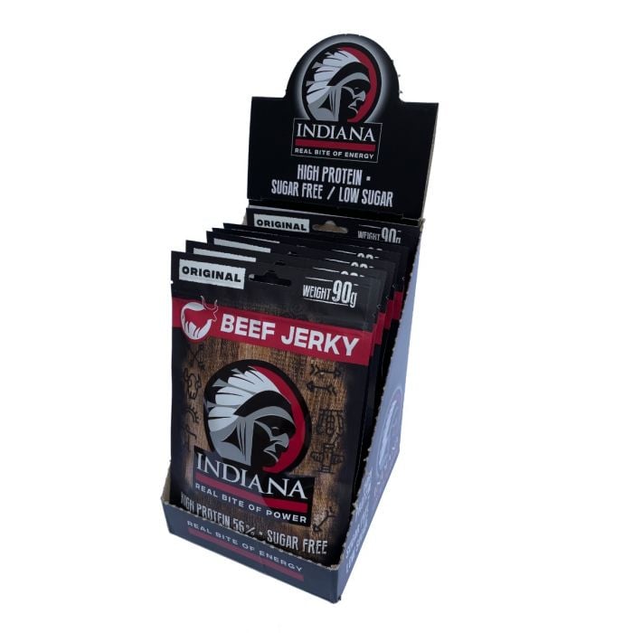 Beef Jerky Original je hovězí sušené maso vyrobené podle starých indiánských receptur nejnovějšími technologiemi přizpůsobené chuťovým buňkám Evropanů. Beef Jerky je nemastný zdravý snack vydatný na bílkoviny. V 100 g sušeného masa najdete až 56 g bílkovin