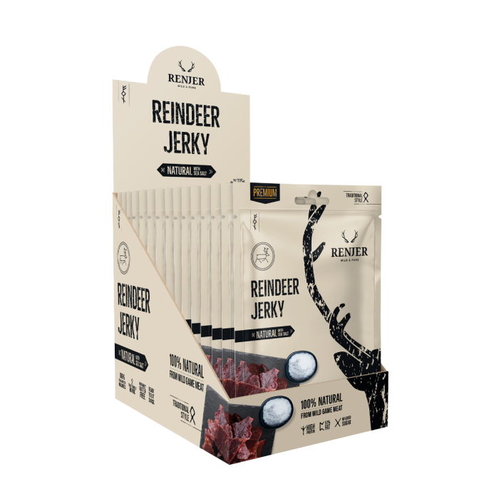 Sušené sobí maso je pýchou švédského výrobce Renjer, který věří, že o čistotu a divokost přírody Severní Evropy je třeba se podělit s každým. Jedná se o lahodné sobí maso, které vzniká šetrným způsobem sušení. Neobsahuje přidaný cukr a jeho autentickou chuť dotváří mořská sůl. Pyšní se vysokým obsahem bílkovin, které přispívají k růstu a udržení svalové hmoty a zdravých kostí.